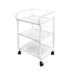 Movable beauty trolley with metal frame, plastic shelves and drawer for storing and placing your work equipment.