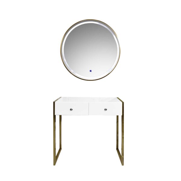 A stylish and functional mirror station designed to elevate any modern salon. Featuring a round mirror and a sleek tabletop with two practical drawers, it provides both elegance and convenience for daily salon use. The white-and-gold finish adds a touch of luxury, making it an eye-catching piece in any workspace.